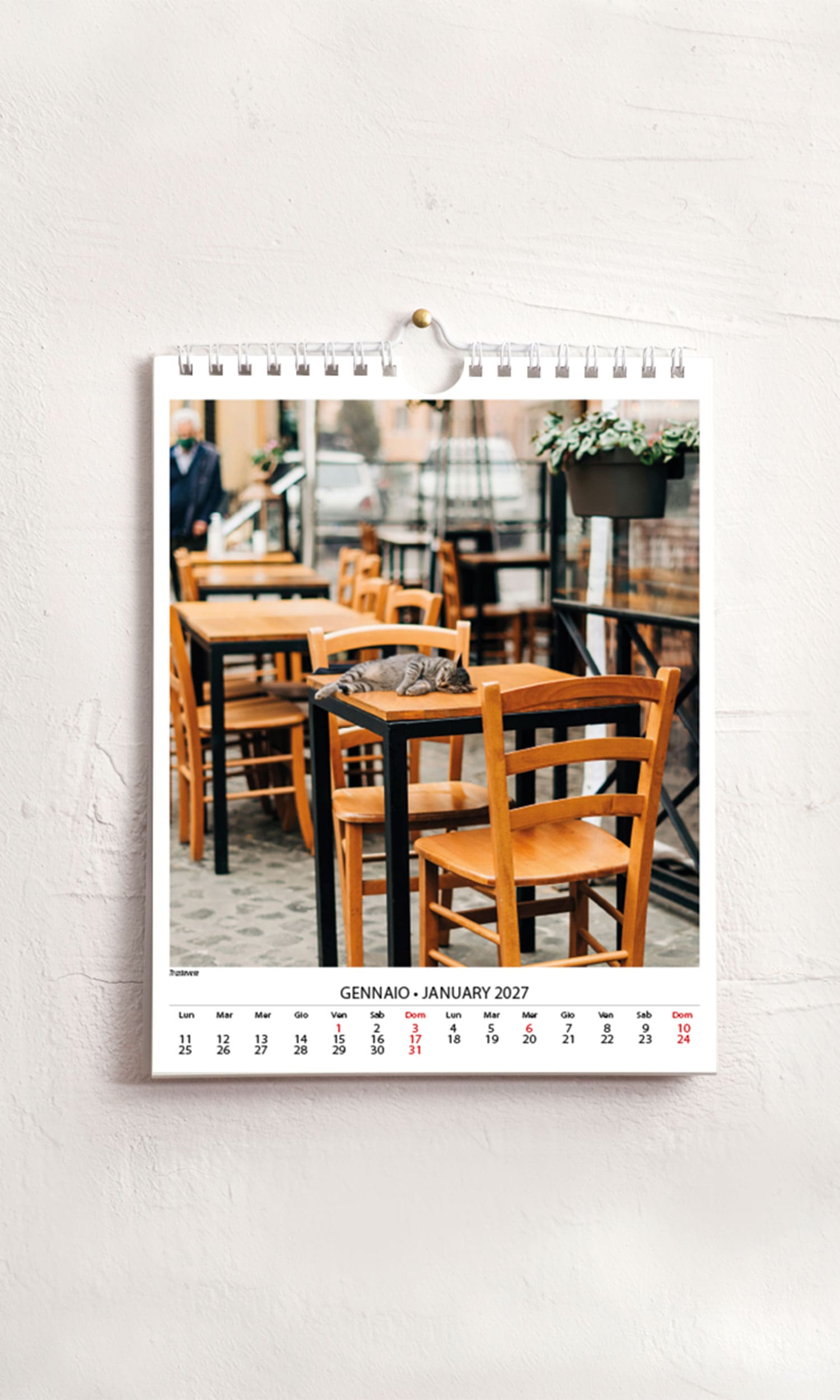 Calendari spiralato dotato di piedino per scrivania e gancetto da muro
